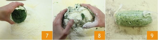 then pour the mixture onto a work surface and add the chopped spinach 7, knead to combine the ingredients 8, then form a dough ball, wrap it with plastic wrap 9, and place it in the refrigerator to set for about 40 minutes. Now prepare the filling: chop the caciocavallo and ham, pat the tomatoes with absorbent paper to remove excess oil, and then cut them into small pieces as well.