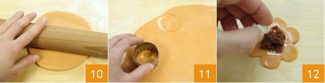 At this point, everything is ready to assemble the pie pops: take the tomato shortcrust pastry dough, roll it out with a rolling pin 10 until you get a 1/16 inch thick sheet, cut out the desired shapes with cookie cutters 11, making sure they are double, brush the dough cutout with the egg white, fill the center with sun-dried tomatoes and caciocavallo 12,