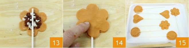 place a food stick in the middle 13, then close it with another cutout of the same shape 14. Set the pie pops aside on a baking tray lined with parchment paper 15.
