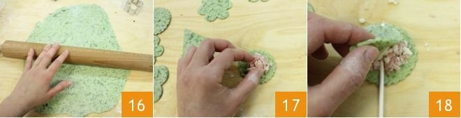 Proceed the same way with the green shortcrust pastry: roll out a sheet about 1/16 inch thick 16, brush it with egg and fill it with the caciocavallo and cooked ham filling 17. Close it with another dough cutout 18.