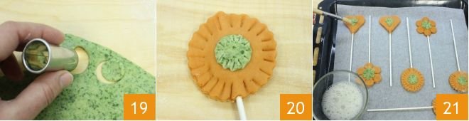 If you want to make the pie pops even more colorful, you can cut out small shapes 19 to apply to the pie pops, alternating colors to create a nice contrast 20. Before baking them, brush the pie pops with egg white 21