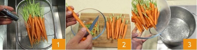 To prepare sweet and sour carrots, start by sanitizing the jars and lids, as indicated in the guidelines of the Ministry of Health at the end of the recipe. Once this important operation is completed, move on to your baby carrots, which must be very fresh and spotless: peel them, wash them under running water 1, and cut off the tip 2. Blanch the carrots in water for 1 minute 3.