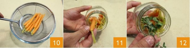 After the necessary time has passed, gently transfer the carrots to a colander using a slotted spoon 10, allowing them to drain and cool. Then transfer the carrots to the jars you previously sanitized 11, trying to arrange the carrots as neatly as possible, without pressing them too much. Add the sprigs of marjoram 12.