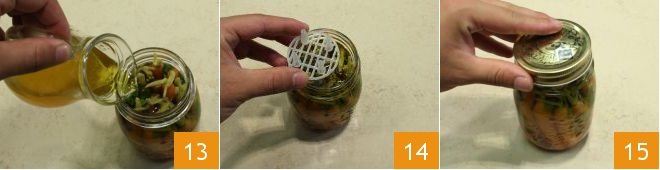 Fill the jars with the cooking liquid, stopping 0.39 inches from the edge of the jar 13. Place the pressing device to ensure the carrots are held in place 14 and close the jars tightly, but not too tightly 15. At this point, proceed to boil the jars, i.e., pasteurization, following the instructions provided in the guidelines of the Ministry of Health mentioned at the end of the recipe. If you use jars with screw caps, once the jars have cooled, check if the vacuum has been achieved correctly: you can press the center of the lid, and if you don't hear the classic "click-clack," the vacuum has been achieved. If after re-boiling you notice the formation of small air bubbles, when the jar is still warm, tap it gently on a surface to make the bubbles rise to the surface, where they will naturally disappear. If you use jars with rubber-sealed closures, when consuming the sweet and sour carrots, you can test the vacuum by pulling the appropriate tab: if pulling it produces a sharp noise, it means the content has been stored with the correct vacuum. On the contrary, if pulling the tab the seal feels "loose," it means the vacuum wasn't created correctly, and it's better not to eat the content. Your sweet and sour carrots are ready to be enjoyed!