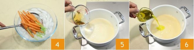 After one minute in boiling water, immediately immerse the carrots in ice water 4 and leave them for 3-4 minutes. This will help maintain the color of the carrots. Take a saucepan and pour the vinegar 5 and oil 6 into it.