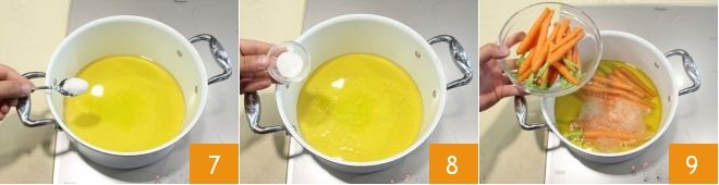 Add the salt 7 and sugar 8 as well. Bring everything to a boil, and then add the carrots 9, blanching them for about 2 minutes. Be careful to respect the times and not to overcook them because it's important that the carrots remain crunchy.