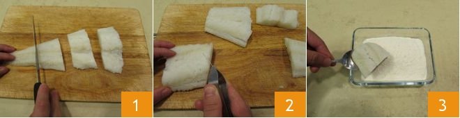 To prepare sweet and sour Ligurian cod, take the already desalted and skinned cod (if you use salted cod it will require at least 3 days of soaking as indicated in the cooking school guide: How to Desalt Cod): start by cutting the fillet into pieces 1, once cut you can also remove all the bones with kitchen tweezers 2. When you have finished, flour all the pieces, shaking them gently to remove excess flour 3.