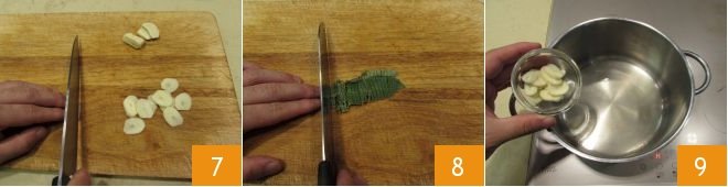 Prepare the sauce: peel and thinly slice the garlic cloves: a couple of millimeters will do 7 and then cut the sage leaves into strips 8. In a pot, pour the white wine and add the garlic slices 9,
