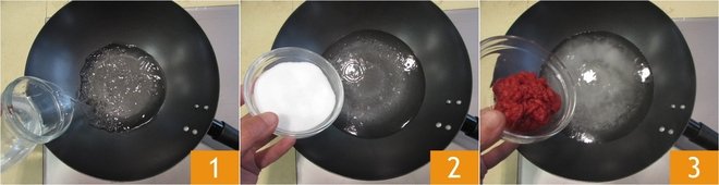 To make the sweet and sour sauce, first pour the water into a wok or small saucepan 1 and bring it to a boil, then add the sugar 2 and the tomato paste 3.