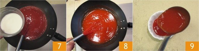 Also add the vinegar and mix well with a whisk as you bring everything back to a boil 4. Meanwhile, place the cornstarch in a separate small bowl, add 4 tablespoons of water 5, and mix the mixture with a spoon 6.