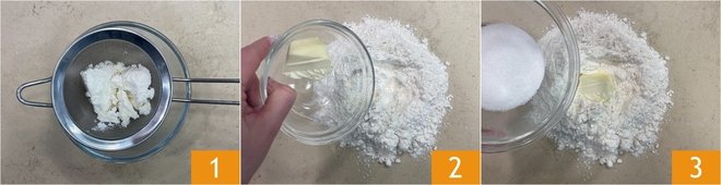 To make the sweet Carnival cappelletti, first, place the ricotta in a sieve and let it drain for about an hour 1. Meanwhile, prepare the dough: place the flour in a mound on the work surface, then add the soft butter cut into cubes 2 and the sugar 3 in the center.