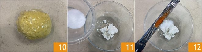 Once you've obtained a smooth and homogeneous dough ball, wrap it in plastic wrap and let it rest in the refrigerator for 30 minutes 10. Take the ricotta, which will have drained the excess liquid, and transfer it to a bowl, then add the sugar 11 and the grated orange zest 12.