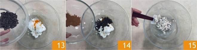 Add the chocolate chips 13 and cinnamon 14 as well, then mix well to combine everything 15.