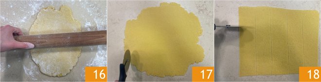 After the dough's resting time, roll it out on a lightly floured work surface to a thickness of about 1/16 inch 16. Trim the edges with a pastry cutter 17 and cut out squares of about 2 inches 18. The scraps can be reworked and rolled out again.