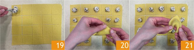 Place a teaspoon of filling in the center of each square 19. Fold the pasta square into a triangle to seal the filling inside 20, then bring the 2 corners of the base downwards 21 and pinch them together. If the dough is a bit dry, you can slightly moisten the edges with a little water to help it stick.
