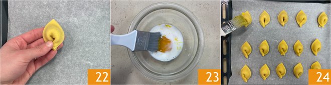 As you form the cappelletti, place them on a baking sheet lined with parchment paper 22. Once they are all ready, mix the egg yolk with the milk 23 and use the resulting mixture to brush the surface of the cappelletti 24.