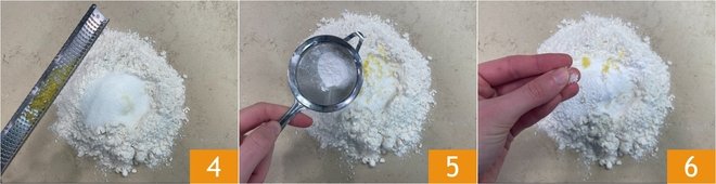 Also add the grated lemon zest 4, baking powder 5, and a pinch of salt 6.