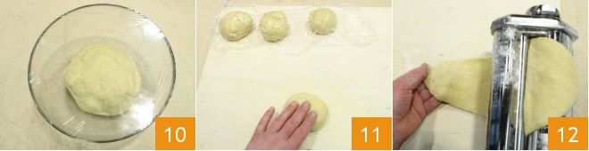 that you will cover with plastic wrap and let rest for half an hour in a cool place 10. Take the dough, divide it into portions (about 5 oz), flatten them 11, and work them with a pasta machine 12 (or a rolling pin) to obtain a thickness of 1/16 inch, which generally corresponds to the penultimate thickness of the pasta roller, for best results consult the cooking school guide How to Roll Out Pasta Dough. If the dough tears during processing, flour it, fold it in three, and pass it through the machine again until it is smooth and compact, passing it from the thicker rollers to the thinner ones.