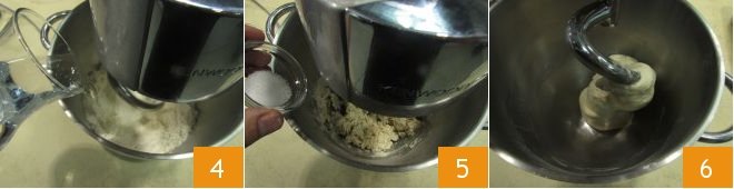 Start the stand mixer at medium speed and begin kneading the mixture with the hook. At this point, add the water little by little 4. Before finishing adding all the water, add the salt to the dough you are mixing 5. Continue mixing at medium speed until you get an elastic and well-incorporated dough 6.
