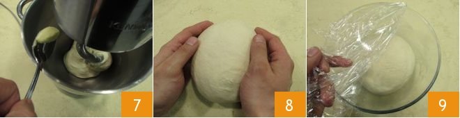 Then add the butter little by little, making sure to add each part only after the previous part has been well absorbed into the dough 7. Now transfer the dough to a work surface and knead it with your hands until you obtain a spherical shape 8. Place the ball-shaped dough in a new clean bowl, previously greased. Cover the dough with plastic wrap 9 and let it rise in the oven with the light on at 86°F for 2 to 3 hours as needed.