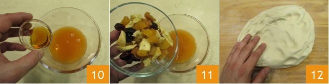 Now proceed with the casatiello filling. Chop the dried fruits coarsely. Now squeeze the oranges in a small bowl to get the juice. Add the herbal liqueur to this juice 10. Now set the dried fruits to soak for about two hours in the juice you obtained 11. Return to the preparation of the casatiello dough. When the dough placed in the oven has doubled in volume, transfer it to a pastry board. There, flatten the dough and stretch it with your hands to obtain a rectangle of about 12 inches X 16 inches 12. The dough obtained should be soft enough not to require the use of a rolling pin.