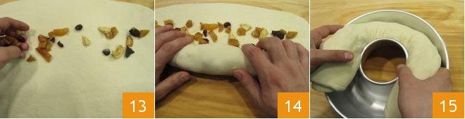 Now drain the dried fruits and spread them over the entire surface of the dough 13. Roll the dough from the long side 14. Grease a 10-inch diameter bundt cake pan and place the casatiello roll in the pan 15.