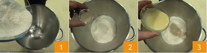 To prepare the sweet casatiello start by making the dough. Take the stand mixer with the hook attachment and pour in the sieved 00 flour and Manitoba flour 1, then add the dried yeast 2. Next, add the condensed milk 3.