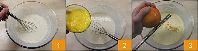 To prepare the sweet crepe cake, start by preparing the crepes that will be the structure of your dessert: put the previously sifted flour in a high-sided bowl, granulated sugar, seeds from half a vanilla bean or a sachet of vanilla extract, a pinch of salt, and the milk. Work the mixture with a hand whisk or an electric mixer until it is smooth, velvety, and without lumps 1. In a separate bowl, beat the eggs with a fork, then add them to the other ingredients 2 and continue mixing. Melt the butter in a saucepan over low heat and let it cool, then add it to the crepe batter and mix thoroughly. Finally, add the grated orange peel to the batter 3.