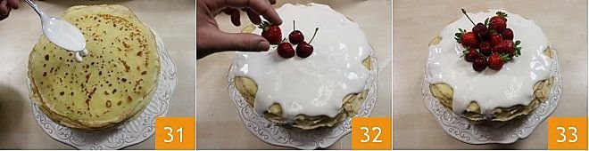 With a spoon, slowly pour the obtained cream over the top of the cake starting from the center 31. Now you can decorate the cake by placing whole cherries and strawberries on top 32 and adding mint leaves to give a scenic touch to your sweet crepe cake 33.