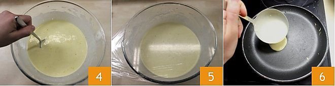 Mix the ingredients well to obtain a dense batter without lumps 4. Cover the batter with plastic wrap and let it rest in the fridge for at least half an hour 5. After the necessary resting time, take your batter from the fridge and start creating your crepes: heat a crepe pan or a non-stick pan with a diameter of 8 inches. Melt a small knob of butter and spread it over the entire surface of the pan with the help of kitchen paper. Then pour a small ladle of batter into the center of the pan 6.