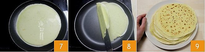 Using the ladle or a spoon, quickly and carefully spread the batter over the entire surface of the pan 7. Let it cook for a minute, lifting the edges of the crepe from time to time with a crepe spreader or a wooden spatula to detach it from the surface; as soon as it is golden, turn it over and wait for it to take on the same color 8. Once ready, remove it from the pan by sliding it onto a plate, and continue the same way with the remaining crepes, stacking them on top of each other as they are ready 9. Cover them with kitchen paper and set them aside.