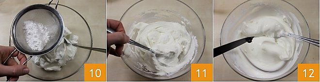 When you have finished the layers, move on to preparing the cream for the garnish: in a bowl, put 100 g of Greek yogurt and dilute it with fresh liquid cream 28; then add the sifted powdered sugar and mix with a spoon until you obtain a fluid cream 30.