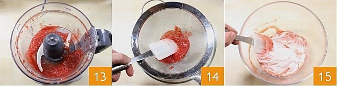 For the strawberry cream: proceed as for the yogurt cream, then put 500 g of Greek yogurt in a bowl and add the sifted powdered sugar, mixing the ingredients. At this point, wash the strawberries, remove the green stem with a small knife, and blend them 13 until you obtain a fine pulp that you will filter with a fine-mesh strainer 14. Now add the filtered pulp to the Greek yogurt and mix thoroughly with a spatula or spoon 15.
