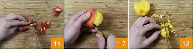 Now prepare the fruit for the filling: wash the strawberries, remove the stem and cut them into cubes 16. Peel the peaches with a small knife 17, cut them in half to remove the pit, and then cut them into cubes 18. Do the same for the apricots.