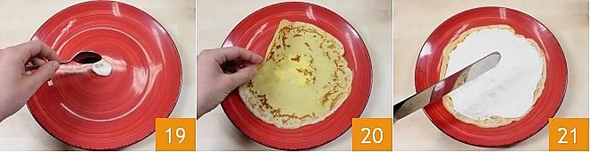 Now you can start assembling your cake: take a serving plate and spread a little yogurt cream on the bottom of the plate so that the base crepe doesn't slide 19. Place the first crepe 20 and spread about two tablespoons of white yogurt cream 21.