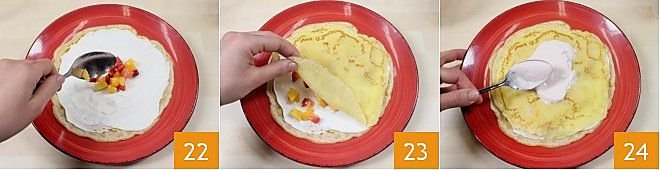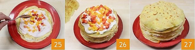 Add a tablespoon of fruit cubes 22 and distribute them over the entire surface, then cover the layer with another crepe 23. Then spread this crepe with about 2 tablespoons of strawberry cream 24 and distribute the fruit cubes as for the previous layer.