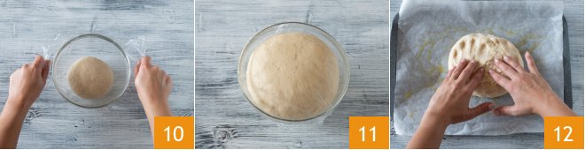 Shape the dough into a ball and place it in a bowl. Cover with plastic wrap and let it rise for 3 hours in the oven with only the light on. After this time, take the well-risen dough 11 and transfer it into a 12x16 inch baking tray lined with parchment paper and greased with a little oil. Gently press with your hands 12