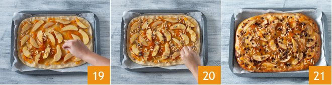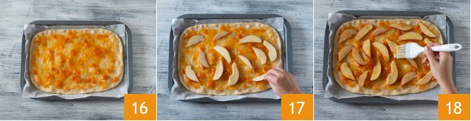 and spread it over the entire surface 16. Also arrange the apple slices on top 17 and brush them with a bit of jam.