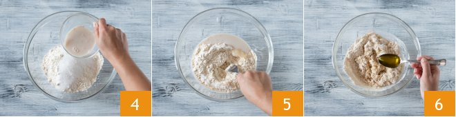 Combine the dissolved yeast in the milk 4 and mix with a fork 5. Then also add the oil 6
