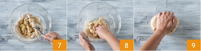 and mix 7. Start kneading with your hands 8, then transfer the dough to a work surface and knead until smooth and homogeneous 9.