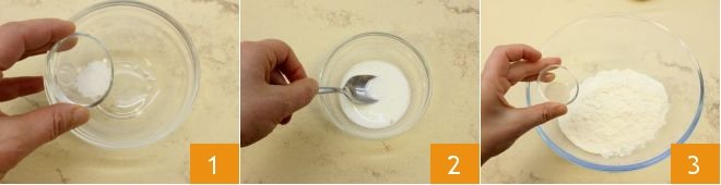 To prepare the sweet pizza with strawberry jam, start by dissolving the salt in warm milk (1-2); in another larger bowl, pour the sifted flour and add the dry yeast 3.