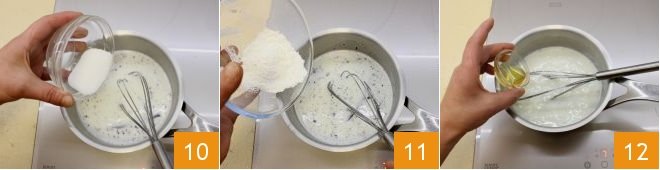 Stir with a whisk, then add the sugar 10 and the sifted cornstarch 11, then also add the honey 12 and let it thicken over low heat.