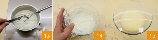 When the cream has thickened, remove the half vanilla bean 13 and pour the cream into a bowl, cover with plastic wrap, making sure it adheres well to the surface so that the annoying skin does not form 14 and let it cool in the refrigerator (you can place the bowl in a larger one filled with ice to cool the cream faster). While the cream cools, take back the dough that has doubled in volume 15
