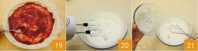 and spread it evenly using the back of a spoon 19. Then fold the edges inward and flatten them with a light pressure from your fingertips. Bake the sweet pizza in a preheated static oven at 356°F for about 30 minutes (or in a fan oven at 320°F for 20 minutes). Meanwhile, whip the fresh cream 20 and gently fold the now cold milk cream into the whipped cream 21: mix to combine the two mixtures.