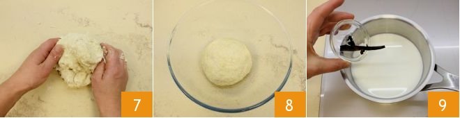 When the dough becomes compact, transfer it to a slightly oiled work surface and knead it until smooth and soft (if it turns out very dry, you can add a little more oil). Once the ball is formed, place it in a slightly oiled bowl 8, cover with plastic wrap and let it rise for at least 3 hours in the oven with the light on. Meanwhile, focus on the milk cream: heat the milk in a saucepan, add the seeds and the split half vanilla bean 9.