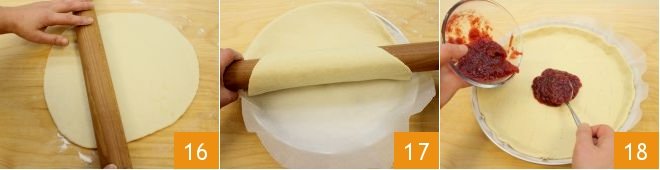 and roll it out on a work surface into a disc with a diameter of 13 inches 16; line a cake pan with parchment paper and roll the dough disc onto a rolling pin, then unroll it onto the cake pan 17. Make sure the bottom adheres well (leave the edges hanging for the moment) and prick the bottom with a fork. Pour the strawberry jam 18