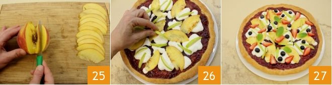 Finish the sweet pizza with fresh fruit: wash and thinly slice the peach with the peel 25, then cut the green apple into sticks, removing a little pulp with a knife; remove the leaves from the strawberries and cut them into 4 wedges. Then decorate the sweet pizza with the peach slices, apple 26, strawberries, and blueberries 27, while the mint will simulate the basil leaves!