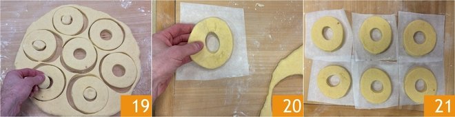Remove the small dough circle to free the hole 19. Place each doughnut on a square of parchment paper slightly larger 20: this way you can easily immerse them in the oil without deforming them 21. Knead the scraps again, let them rest for a few minutes, then roll them out to a thickness of 0.8 inches and cut out 3 more doughnuts. These will be the last ones to fry.
