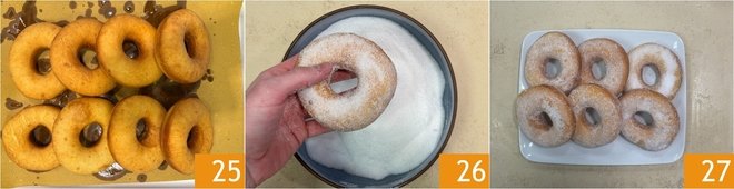 Transfer the fried doughnuts to a tray with paper towels, then immediately pass them in granulated sugar 26, so they are well coated. Sweet potato doughnuts are ready to enjoy; they will be even better warm 27!