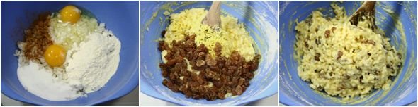 Place 10.5 oz of already cooked rice in a large bowl along with two small eggs, flour, the grated zest of 1 lemon, a pinch of ground cinnamon, sugar, and previously soaked raisins.
